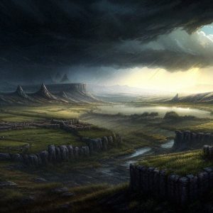 Rain fell as a soft hushing blanket, thunder rolled in the distance in an almost comforting tone. To the south lay the bleak desert; this gave way to grasslands to the west, east, and north. A steep cliff was visible in the northern distance; some vast dark woodland loomed silently through the mists to the west. In the center, here, was the place where it all began. The place where the people came together.
